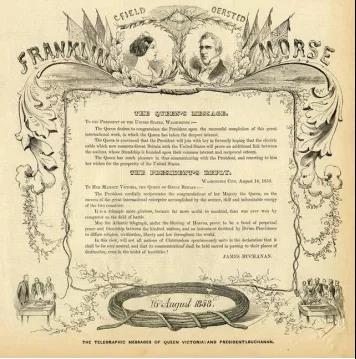 幾個(gè)小時(shí)后,世界一片歡騰,全世界的人們都在興奮的等待著這一刻。1858年8月16日,維多利亞女王發(fā)給美國(guó)總統(tǒng)布坎南的賀電通過海底電纜傳到北美,布坎南向英國(guó)女王回電,同時(shí),禮炮鳴放100響,慶祝人類這一偉大的歷史時(shí)刻。