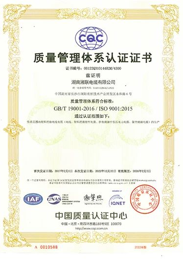 近年來,湘聯電纜始終以“質量是發展的基石,是客戶信任的唯一理由”的質量方針為導向,逐步建立了高標準質量管理體系。從采購、生產、檢測等方面實施全方位質量把控,落實各方面質量責任,實現全過程質量追溯。做到最大限度消除質量隱患,產品質量和客戶滿意度不斷提升。公司先后通過國家強制性產品認證(CCC認證)、全國工業生產許可證、“三位一體”管理體系、武器裝備質量管理體系認證,獲評專精特新小巨人企業、企業標準“領跑者”等榮譽,得到業界廣泛認可和贊譽。